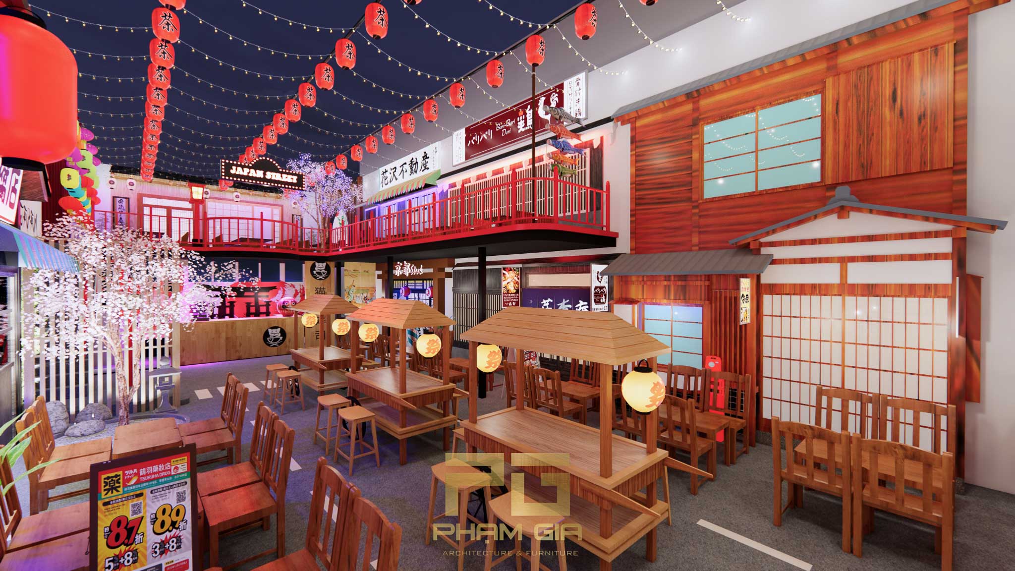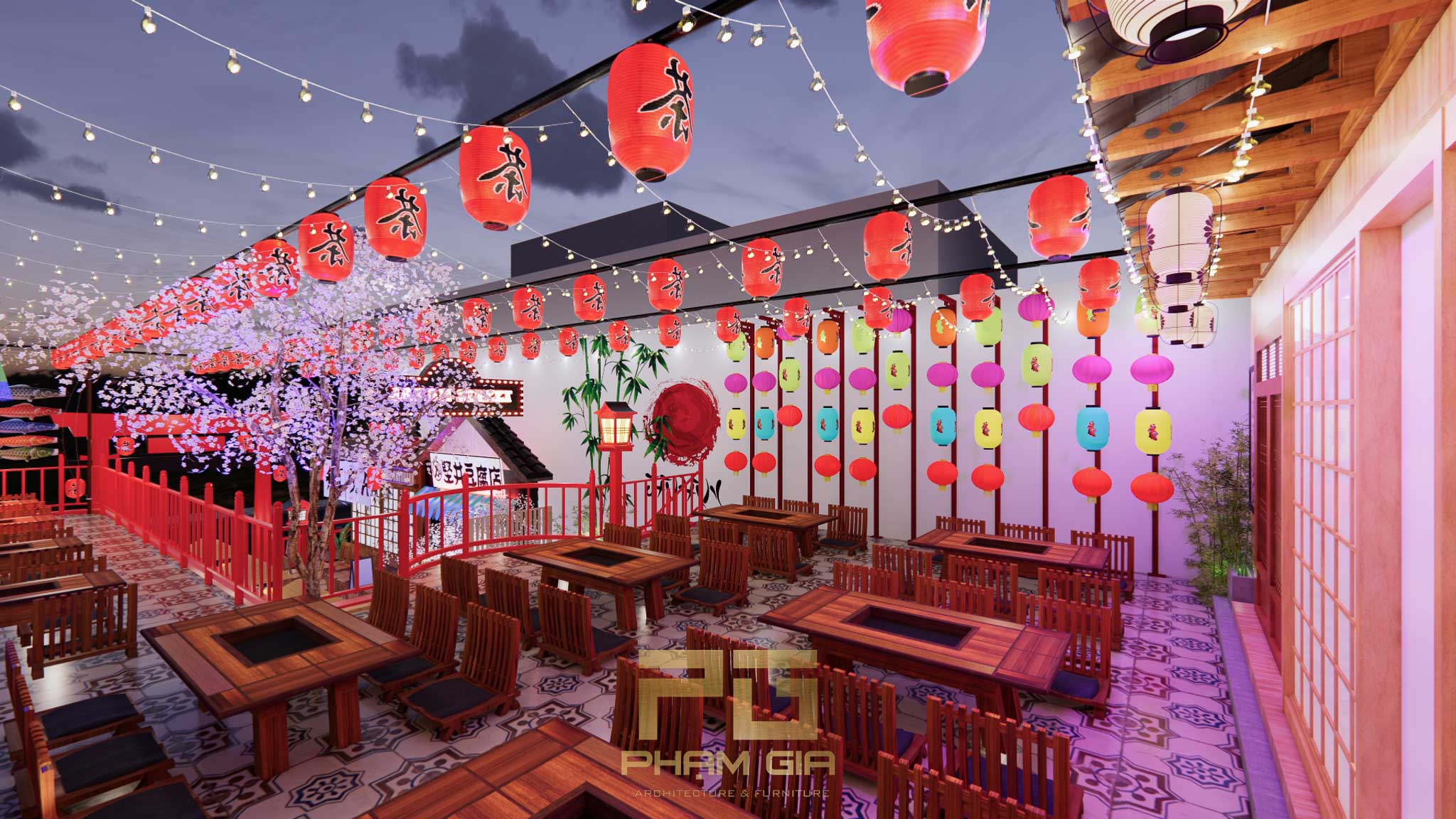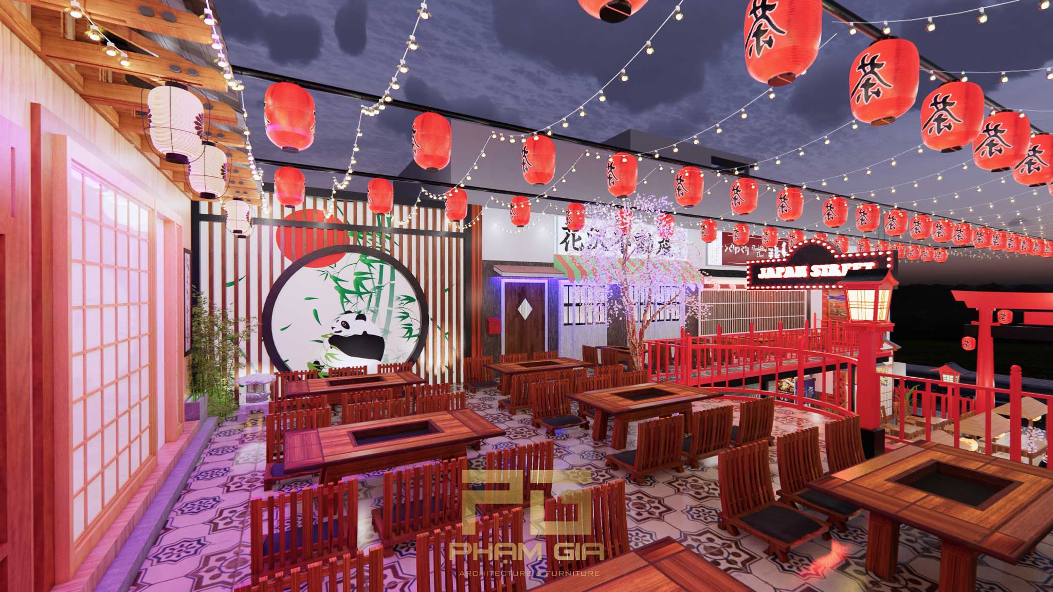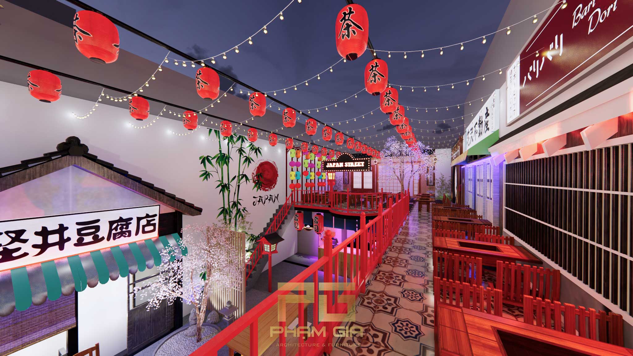 Mặc dù mang đậm dấu ấn truyền thống, Hẻm Phố Nhật Bản không quên cập nhật những yếu tố hiện đại. Ánh sáng được bố trí tinh tế, kết hợp giữa đèn lồng cổ điển và hệ thống chiếu sáng hiện đại, tạo nên không gian ấm cúng và sang trọng. Bên cạnh đó, việc sử dụng các vật liệu tự nhiên như gỗ, đá, và tre không chỉ làm tăng tính thẩm mỹ mà còn thân thiện với môi trường.